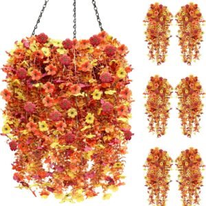 Hanging Flowers: A set contains 6 bunches hanging fake flowers (red, yellow and orange) with 5 branches in each bunch. GlimLit fake flowers have full buds and stems, adding a splash of color to your life wherever you place them
